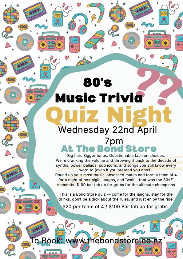 Break out the leg warmers and tease that fringe — it’s time for 80s Music Trivia Night at The Bond Store. From power ballads to pop anthems, one-hit wonders to absolute legends, this quiz is a love letter to the decade that gave us bangers, bravado, and way too much hairspray.